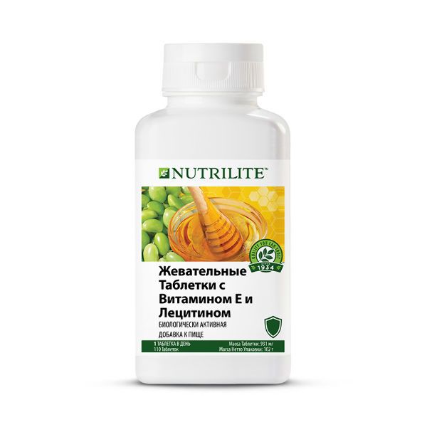 Nutrilite™ Жевательные таблетки с витамином Е и лецитином от Амвей. Витамин Е является важным компонентом питания, так как наш организм не способен самостоятельно его синтезировать. Потребление основных источников витамина Е в России и Казахстане составляет около 10 литров в год на человека, хотя рекомендуемая норма достигает 12 литров. К источникам витамина Е относятся растительные масла, семена, орехи, яйца, печень животных, капуста, шпинат, соя, грибы и проростки пшеницы.